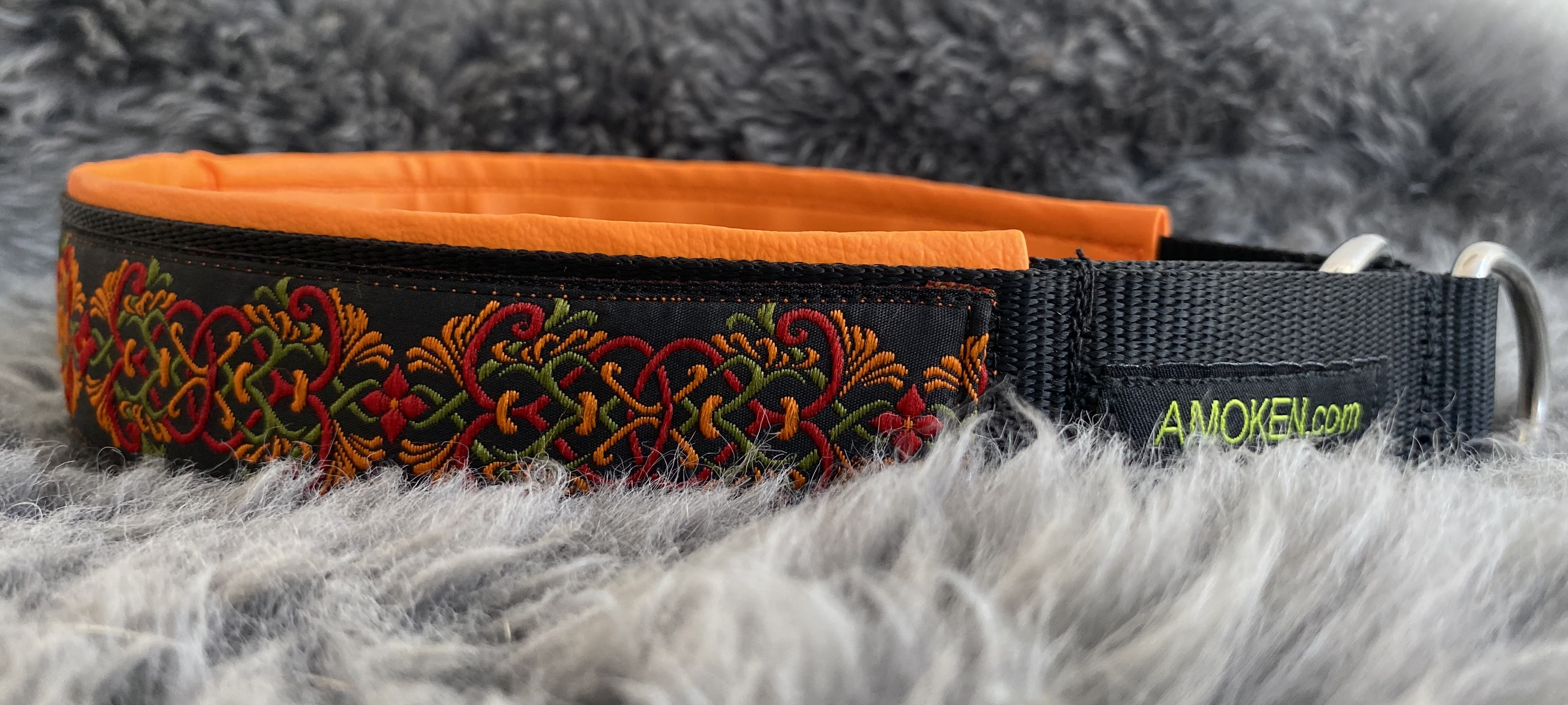 Halsbåndet har et dekorativt bånd på forsiden, og er foret med sort imiteret skin, der gør det behageligt for hunden at have på.
